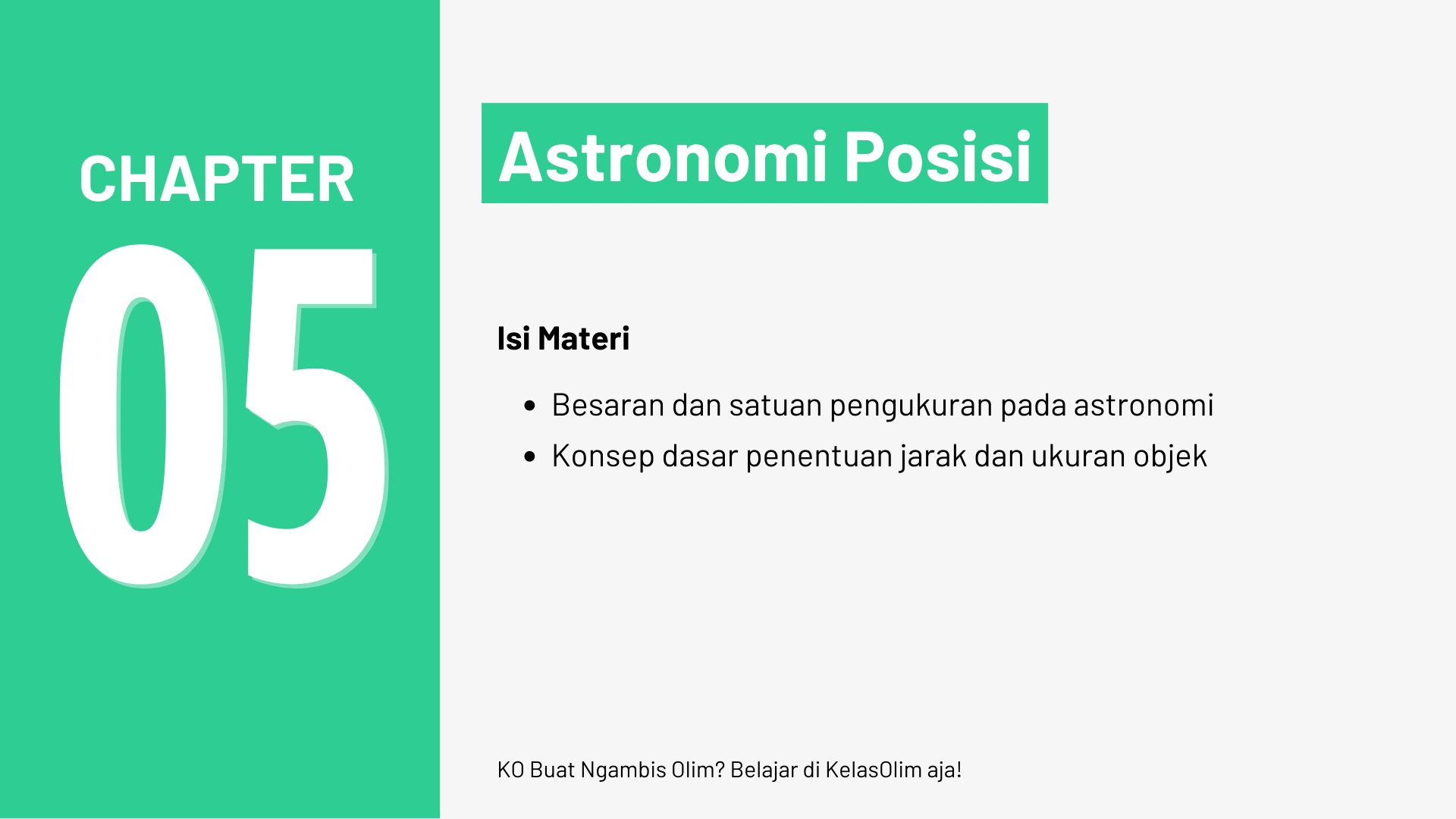 Kelas ini dirancang khusus untuk peserta didik yang ingin memahami konsep awal metode perhitungan jarak dan ukuran objek-objek astronomis seperti Matahari, Bulan, dan bintang-bintang di langit malam. Topik Astronomi Posisi memegang peranan penting dalam penyelesaian permasalahan jarak dan ukuran objek di langit yang kita sebagai pengamat tidak dapat mengukurnya secara langsung dan akan selalu muncul pada bidang soal-soal Olimpiade Astronomi. Kelas ini menggunakan pendekatan yang sistematis, membahas konsep-konsep fundamental astronomi posisi dan aplikasinya, serta memberikan latihan soal uraian yang berbasis pemahaman konsep.